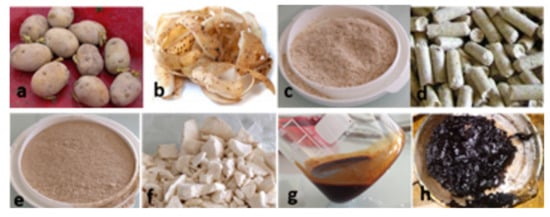Different samples of potato by-products used in the present work: (a) coarse or seed potato (CPo), (b) fresh potato peels (FPPe), (c) dehydrated potato pulp (DPP), (d) coarse potato pulp or “pellets” (PPP), (e) ground and sieved pellets (GSP), (f) lyophilized flesh potato (LFPo), (g) red liquid (RL), and (h) lyophilized red liquid (LRL).