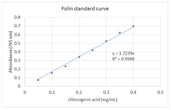 Folin–Ciocalteu reagent is widely used to measure total phenolic compound amount in plant materials. For our purpose, the methods described by [23] and [34] were adjusted and undertaken with 0.5 mL of potato sample extract. Folin reagent (1 mL) was added to the extract, followed by 1 mL of 7.5% sodium carbonate solution (5% w/w). After shaking, the mixture was left for 90 min in darkness at room temperature, so a greenish-blue color appeared. Then, absorbance was measured at 765 nm, using an Ultrospec 2000 UV–Visible spectrophotometer (Pharmacia biotech, Guyancourt, France). A calibration curve (Figure 7) was obtained by using chlorogenic acid (5-CQA) as the standard, and the total phenolic compounds of extracts were estimated as milligram equivalent of chlorogenic acid per gram of potato sample powder.