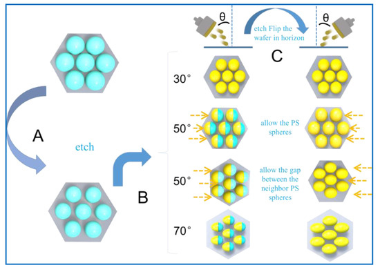 Schematic diagram for the preparation procedure of different shaped nanocaps array (A) monolayers on a Si wafer by a self-assembly method. (B) PS spheres separated by etching. (C) Au nanocaps with different shapes on the PS sphere arrays by depositing Au twice with different rotation angles.