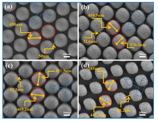 The mixed solution (volume ratio NH4∙H2O:H2O2:H2O = 1: 2: 6) with Silicon wafers was kept in a beaker to boil for 5 min, and then the silicon wafers were washed by ultrapure water and ethanol three times, after which hydrophilic silicon wafers were obtained and stored in ultrapure water for future use. 100 uL PS aqueous solution was mixed with 100 μL ultrapure water, and a pipette was used to drop a suitable amount of the mixed solution onto the hydrophilic silicon wafer and then the wafer was slowly dipped into a container filled with ultrapure water. The polystyrene colloid particles formed a disordered monolayer on the water surface, which was driven by 2% sodium dodecyl sulfate solution to form a highly ordered monolayer on the surface. Finally, the ordered PS monolayer film was picked up by the clean silicon wafer, and the excess water was sucked up with the filter paper. After natural drying in the air, a highly ordered hexagonal densely stacked polystyrene template formed on the silicon wafer.