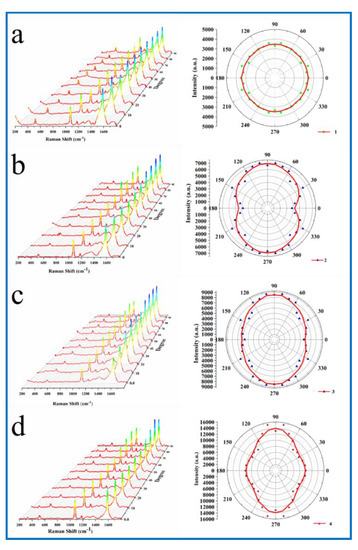The left figure (a–d) is the spectrum diagram of SERS of 4-MBA adsorbed on samples of different shapes changing with the angle of excitation light, and the right figure is the polar coordinate diagram of corresponding SERS strength changing with the angle of incident excitation light.