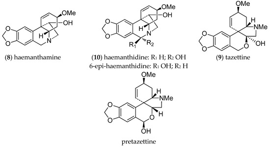 - Zhong, J. Amaryllidaceae and Sceletium alkaloids. Nat. Prod. Rep. 2008, 24, 886–905. [Google Scholar] [CrossRef]