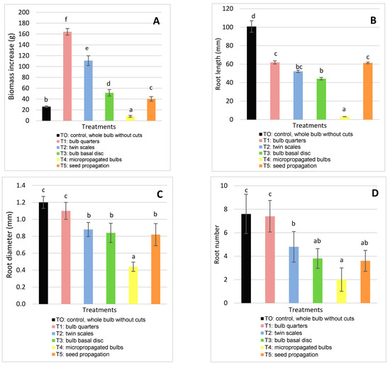 Effect of the propagation method on biomass increase (A); root diameter (B); root length (C); and root number (D). Means and standard deviation are reported. Data were analyzed by ANOVA and different letters (a, b, c, d) indicate significant differences by the Tukey test (p < 0.05). The treatments were: T0 (Control): whole bulb, T1: bulb quarters, T2: twin scales, T3: bulb basal discs, T4 micro propagated bulbs and T5: seed propagated bulbs.