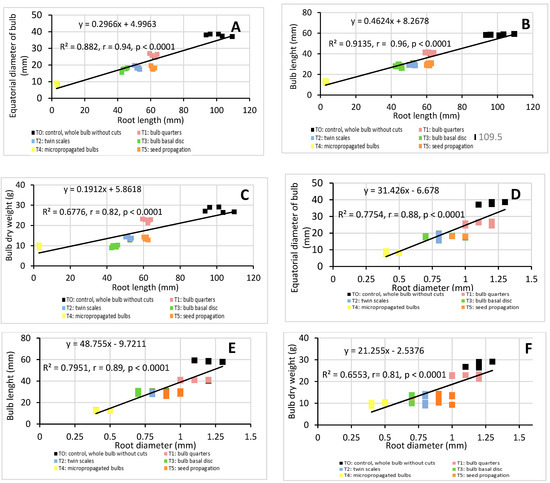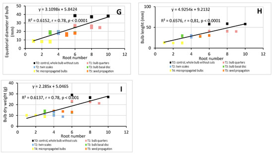 Linear correlation analysis: root length-equatorial bulb diameter (A), root length-bulb length (B), root length-bulb dry weight (C), root diameter-equatorial bulb diameter (D), root diameter-bulb length (E), root diameter-bulb dry weight (F), root number-equatorial bulb diameter (G), root number-bulb length (H), root number-bulb dry weight (I). Coefficient of determination (R2) and Pearson’s correlation coefficient (r) are reported. p < 0.05 indicate that the linear correlation is statistically significant.