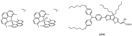 In 2011, a record efficiency of 7% (ηrel, iodine = 108%) was reached by Wang et al. [32] employing [Cu(2,9-dimethyl-1,10-phenanthroline)2]+ and [Cu(2,9-dimethyl-1,10-phenanthroline)2Cl]+ as redox mediators in combination with the sterically hindered organic dye C218; the structure of both the redox mediators and the dye is shown in Figure 2.
