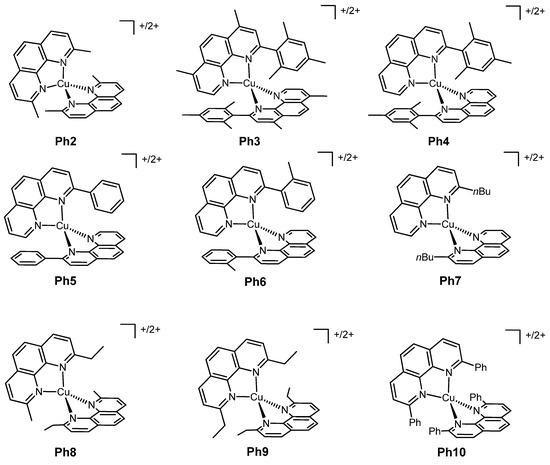 A similar approach was presented by Imahori et al. in their 2020 work [38], with the difference that the redox couples were tested together with the organic dye LEG4 and that the phenanthrolines had substituents also in position 9. The proposed copper-containing complexes were Ph7, Ph8, Ph9 and Ph10, whose structure can be seen in Figure 4.