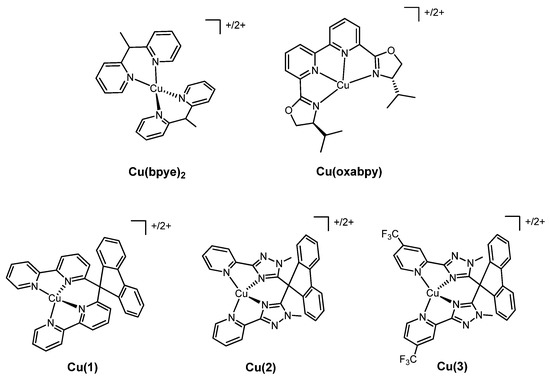 Another approach towards the fixation of the coordination geometry of copper cations, in order to reduce the energetic loss which follows the change in oxidation state, was presented in the 2018 work of Freitag et al. [53]. In that paper, the ligand was the tetradentate molecule 6,6′-bis(4-(S)-isopropyl-2-oxazolinyl)-2,2′-bipyridine (oxabpy), binding the copper atom through the four nitrogen atoms. The Cu(oxabpy) complexes (Figure 7) were coupled with the organic dye Y123 (structure in Figure 5).