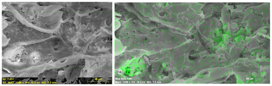 SEM images of a cryogenic cross-section fracture of the hybrid material (a) and EDX iron mapping on the same image, with the green color representing the Fe concentration (b).