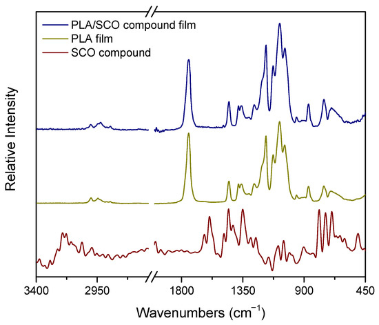 The ATR/FTIR spectra of the neat PLA film (middle), the SCO compound (bottom) and the PLA/SCO compound film (top) are shown in Figure 2. The ATR/FTIR spectra of the PLA film before and after the incorporation of the SCO compound are almost identical. In both samples, characteristic vibration absorption bands of PLA are present, such as at 1747 cm−1 (-C=O carbonyl stretch), 1456 cm−1 (-CH2 bend), 1180/1080 cm−1 (-C-O- stretch) and 1043 cm−1 (-OH bend) [31]. The incorporation of the SCO compound at 0.5% w/w into the hybrid material does not appear to contribute to the overall ATR spectrum of the composite.