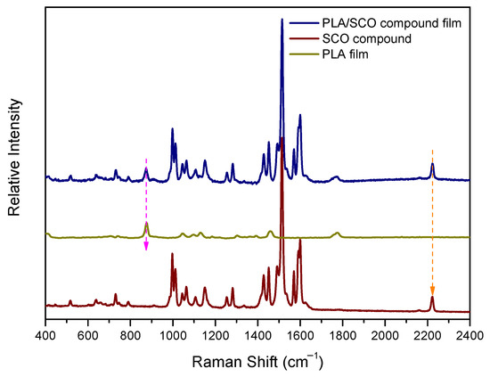 The Raman spectra of the PLA/SCO composite film, the neat PLA and the SCO compound.