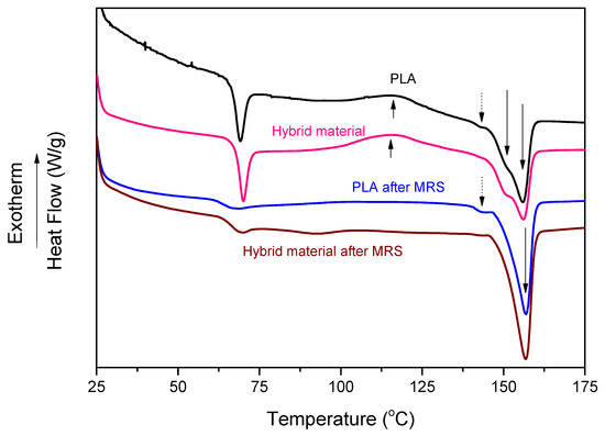 where ΔHm and ΔHc are the enthalpies of melting and cold crystallization, respectively, and ω is the SCO compound weight fraction. ΔH0m is the melting enthalpy of 100% crystalline PLA given as 93.7 J/g [48].