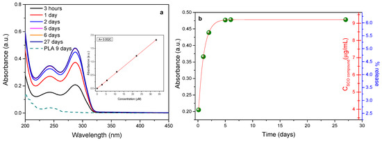 Figure 5a shows the UV/Vis absorption spectra of the solution in contact with the PLA/SCO compound film bound to the migration cell as a function of time, while Figure 5b indicates the resulting concentration and percentage of the SCO compound released in the 50% EtOH solution for the various times. As noticed within the first hours, there was a clear increase in the release. This reached a plateau value after five days, with a total release being about 6% of the total amount of SCO compound in the film. This behavior could be most properly described as a leaching rather than a migration process. Most probably, part of the SCO material that did not fully integrate into the PLA matrix but remained on its surface was easily released into the simulated solution during the early stage of migration. This is further supported by a second migration/release study, which was performed by using the sample used in the first migration study. As it was revealed, no further release was noticed on this second-run migration study (Figure S3). The relatively low overall release of the additive may be attributed to the high activation energy values required for its diffusion by the PLA/SCO nanocomposites. The existence of corresponding high energy values has also been mentioned in other PLA-based nanocomposites [43,44]. The release of pure PLA was also considered. An absorption band at ~245 nm was present after nine days in the neat PLA film. This band remained stable at its maximum absorption even after the 27 days of the total duration of the migration process, in line with the stability already shown by the PLA in similar conditions to the present study [45]. Even if the categorization of the SCO substance as acceptable or not concerning its release limit is not profound, and an independent research activity referring to the toxicity limits of this system is required, according to EU regulations, there is a general limit in which the upper acceptable limit of substances in contact with food is 10 mg of substance/1 dm2 of packaging material. Based on this limit, in our case, even if most of the amount of the SCO compound was released into food simulant (which is not the case and only 6% is released), we will fairly cover this requirement of the EU [46].