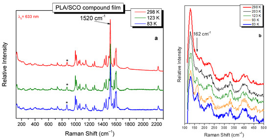 The Raman spectra of PLA/SCO compound film for various temperatures (a) and the low-frequency region of the Raman spectra after normalization (b). A noticeable difference in the spectra is the appearance of the band at 162 cm−1 at the low temperatures examined. The characteristic band of PLA at ~870 cm−1 is indicated with an asterisk in the Raman spectra.