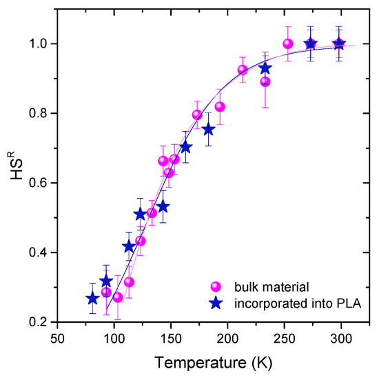 In order to ensure that the effectiveness of the SCO functionality remained during the incorporation process, the temperature-dependent Raman spectra of the polymer hybrid material were compared with the corresponding neat SCO compound; they were found to be closely comparable. Figure 7 depicts the temperature dependence of the HS population extracted from the Raman spectra of the hybrid material. The total SCO behavior of the compound (curve motif and T1/2 value) did not seem to be affected after the incorporation of the SCO compound into the matrix. This stability of the SCO functionality after incorporation is considered an important finding for the perspective of practical implementation of SCO compounds.