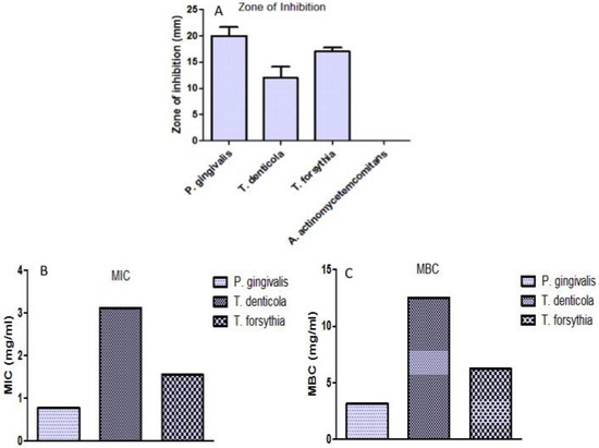 Effect of ethanolic extract of N. deflersiana against periodontal bacteria. (A) Zone of inhibition formed by N. deflersiana extract against P. gingivalis, T. forsythia, and T. denticola. (B,C) MIC and MBC values of N. deflersiana extract against P. gingivalis, T. forsythia, and T. denticola.