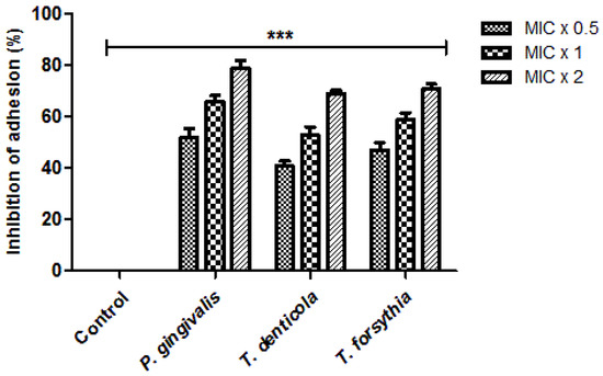 The adhesion process was performed by utilising Alamar blue dye in order to evaluate the efficacy of N. deflersiana on the examined adherence of the bacteria. It was seen that bacterial cells, when treated with varying concentrations of the extract, showed unpredictable bacterial adherence inhibition, stipulating that the consequence was concentration-dependent (Figure 2). For bacterial strains such as T. forsythia, T. denticola, and P. gingivalis, the plant extract was proficient enough to inhibit the adhesion of bacterial strains ranging from 41% to 52%, 53% to 66%, and 60% to 79% at MIC × 0.5, MIC × 1 and MIC × 2, respectively. The tested bacterial strains with zero concentration of extract were contemplated as control. The findings suggested that the N. deflersiana plant extract was sensitively proficient in diminishing bacterial strains’ adhesion, even at concentrations considered subinhibitory.