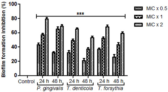 N. deflersiana extract diminishes biofilm formation. P. gingivalis, T. forsythia, and T. denticola were incubated with MIC × 0.5, MIC × 1, and MIC × 2 values of N. deflersiana extract in biofilm-producing environments for 24 and 48 h. Control bars specify each untreated bacterial strain, revealed as 0% inhibition. The data is conferred from three independent investigations using means ± SD *** p < 0.0001.