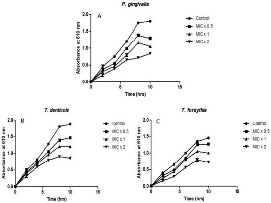 Effect of N. deflersiana on bacterial growth kinetics. Illustrative bacterial strains of (A) P. gingivalis, (B) T. denticola, and (C) T. forsythia were treated with different concentrations (MIC × 0.5, MIC × 1 and MIC × 2) of ethanolic extract of N. deflersiana. Untreated bacterial growth cycle was considered as growth control. The absorbance was measured at 610 nm at five-time intervals of 2 h. The data was conferred from three independent investigations using means ± SD (p < 0.0001).