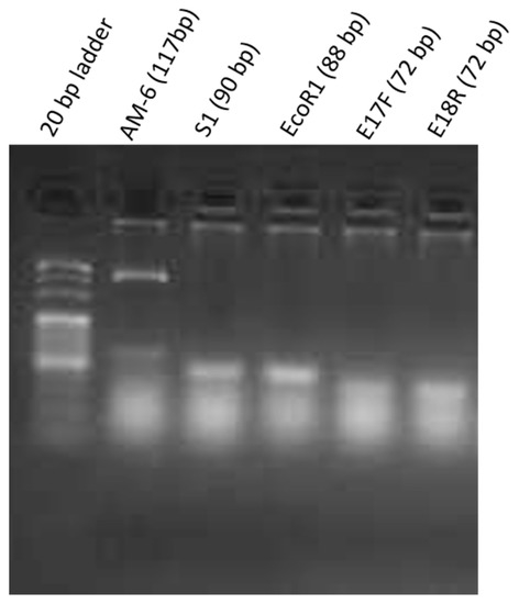 Agarose gel electrophoresis (1.5%) of aptamer amplicons by PCR lane 1—20 bp DNA marker, lane 2—AM6 aptamer, lane 3—S1 aptamer, lane 4—EcoR1 aptamer, lane 5—E17F aptamer, lane 6—E18R aptamer.