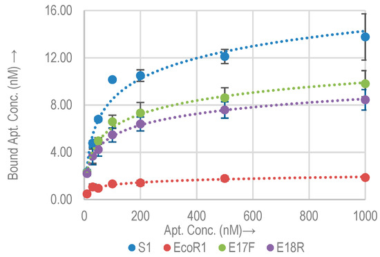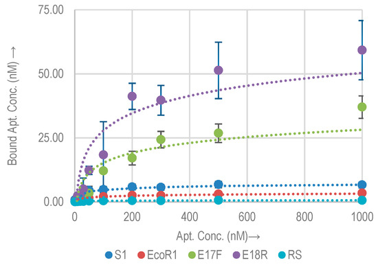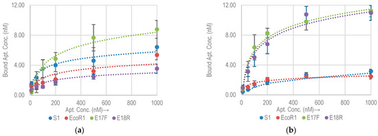 Chemical modifications can potentially affect the aptamer binding to their targets, which makes the evaluation of each modification important [31,32]. Previous research showed that the binding affinity of aptamers can change significantly by attachment of biotin tags. For example, in [24], aptamer (PA#2/8) selected for Protein A (a cell surface protein in gram positive bacteria) showed decreased binding upon 5′ biotinylation whereas the binding improved upon biotinylation at 3′. However, a 3′ biotin modification can potentially affect primer binding during amplification reactions. To avoid this only 5′ biotinylation modification was selected for all the aptamers under study, in order to evaluate the change in their binding capacities with E. coli O157:H7. Figure 5 shows the associated binding isotherms.