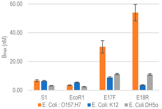 Relative Bmax comparison against non-specific E. coli bacterial strains. Data represent Mean ± SD of 3 independent experiments.