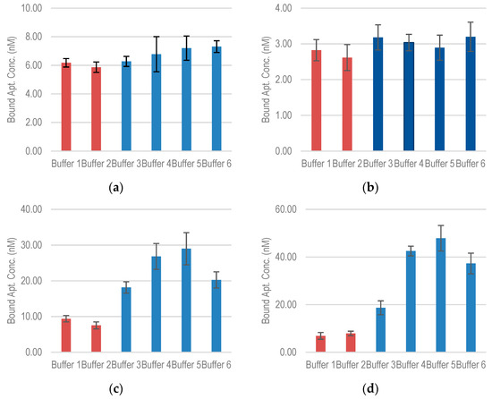 For aptamers S1 and EcoR1, the absence of Mg2+ was not found to have a significant effect on the binding capacity (Figure 6a,b). For S1, the addition of 5 mM K+ reduced the binding capacity by about 5%. As Mg2+ concentration is varied from 0.5 mM to 10 mM, the binding concentration increases by about 15%. In EcoR1, a similar effect was observed with the addition of K+, while the increase in Mg2+ does not cause any significant change in the binding capacity.