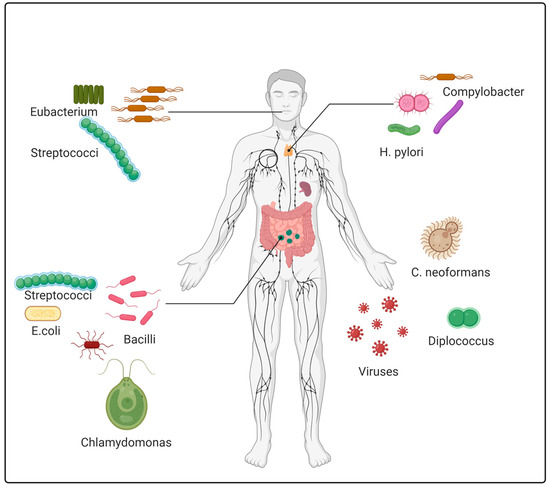 The human gut has a diverse microbial ecosystem that includes viruses, fungi, archaea, and bacteria. Bacteria play a major role as microbiota and mostly belong to phyla Bacteroidetes, Proteobacteria, Firmicutes, and Actinobacteria. Microbes have been found to be involved and associated with 10–20% types of human cancer (Figure 1). Efforts are being made to characterize microbes affecting cancer progression and inhibition, including in affecting responses to various treatments given to patients. In response to cancer progression, various microbes have been reported that causes disease, as shown in Table 1 [20,21,22,23,24,25]. Increment level of Escherichia coli, Staphylococcus bovis, Fusobacterium nucleatum, Clostridium spp., Streptococcus spp., and Bacteroides have been reported incolorectal cancer, while decrement in level of Lactobacillus, Microbacterium, Anoxybacillus, and Akkermansia muciniphila. A list of common cancers and their associated microbes is given in Table 1 [26,27,28,29,30,31,32,33,34,35]. The presence of microbes could be used as a bioindicator to ensure early detection and therefore treatment of disease at its early stages. A method to trace those microbes in response to disease should be devised [36,37,38,39,40]. Microbes need to be characterized in each kind of cancer, and proper control measures need to be devised for treatment [40,41,42,43]. Several microbes have been causally linked to various types of cancers, e.g., Helicobacter pylori are the major causative agent of gastric lymphoma, gastric adenocarcinoma, and esophageal adenocarcinoma, while the Epstein–Barr virus (EBV) causes lymphomas and nasopharyngeal carcinoma [44,45]. Other viruses have been reported to cause other types of liver and lymphatic cancers are shown in Table 2 [46]. Intestinal flora and its metabolites work as major causativeagents ofcolorectal cancer. Diverse flora present in the intestine are manyprobiotic microbes, namely Bifidobacterium, Streptococcus thermophilus, Lactobacillus rhamnosus and Lactobacillus acidophilus, in addition to pathogenic bacteria such as Enterococcus faecalis, Bacteroides fragilis, Clostridia, Fusobacterium nucleatum, Streptococcus bovis, Salmonella and Enterotoxigenic [47,48]. Therefore, proper screening and microbiome classification could further provide knowledge of disease occurrence and progression.