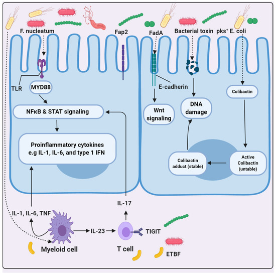 Three major examples of the possible mechanism through which microorganisms cause colorectal cancer. F. nucleatum, ETBF, and polyketide synthase-expressing (pks+) E. colihave a causative role in mediating colorectal cancer.