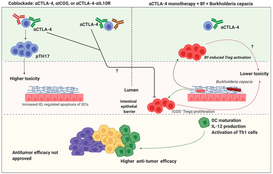 CTLA-4 is a type of protein found in specific T cells that function as a type of “off and on switch” that introduces vigilance into the immune system [175]. Ipilimumab (Yervoy) is a CTLA-4-associated monoclonal antibody (mAbs) that improves the body’s immune response to cancer cells. It is widely used for the treatment of skin melanoma and cureently under investigation for other forms of cancers [176]. Some microbes such as B. fragilis, B. thetaiotaomicron, B.cepacia, G. formicilis, and F. prausnitzii alter in response to the immune checkpoint inhibitor. Mycobacterium bovis has been used to treat bladder cancer for over a century, and other microbial products have been used for immune activation, apoptosis induction, and vasculogenesis inhibition [177,178]. Recent reports suggestedthat the microbiome plays a major role in improving immunotherapy, focusing mainly on PD-1 pathways and checkpoint inhibitor therapy targeting CTLA-4 [179]. Recent observations indicate that the response to checkpoint inhibitors differs greatly between patients. Responses, such as gastrointestinal and liver toxicity associated with checkpoint inhibitor therapy and differences in treatment-related toxicity may also be beneficial [180]. Some studies, for example, understanding the role of Akkermansia muciniphila, a gut microbiome enriched with Bacteroidetes, helps to answer these questions [181]. Bifidobacteria spp. Are known to protect against anti-CTLA-4-associated immune-mediated colitis [182]. Other studies have shown that it is safer to react to PD-1 blockades for healthy bacteria in the intestinal microbiome [183]. In patients with Faecalibacterium prausnitzii, higher loads and lower abundance of Bacteroides after anti-CTLA-4 therapy led higher risk factors for colitis [184]. Bifidobacteria, Akkermansia muciniphila, and Ruminococcaceae bacteria are usually associated with health factors. Those related to immunogenicity are Alistipes, Collinsella and Enterococcietc alters anti-CTLA-4 therapy [185]. The risk of infection and graft-versus-host disease (GVHD) after allogeneic hematopoietic stem cell transplantation (ASCT) in hematological malignancies is controlled by gut bacteria. Early applications of systemic broad-spectrum antibiotics are correlated with increased GVHD and mortality associated with transplantation, probably due to the depletion of the gut microbiota of defensive Clostridiales and Blautia species [186]. CTLA-4 Ab injections are sufficiently important to influence the content of microbiomes at the level of the genus. Studies on Burkholderiales and Bacteroidales found that the CTLA-4 blockade rapidly causes a comparative increase in Clostridiales quantity in feces [187]. Quantitative polymerase chain reaction (qPCR) studies have shown that targeting the Bacteroides genus and bacterial species in small intestine mucosa and feces are novel trend to study [188]. Promenent increment of content observed in organisms such as B. uniformis and B. thetaiotaomicron (Bt) from 24 to 48 h after CTLA-4 Ab injection in the mucosa of the small intestine [189]. Isolated and distinguished by one of the main regulatory Bacteroides, B. fragilis (Bf) was quickly found to be observable by regular colon mucosal PCR, while no increment of CTLA-4 Ab observed [190]. The therapeutic effects of cyclophosphamide administration [191] are decreased by some particular bacterial organisms, such as Parabacteroides distasonis, which drives Treg effects and SFBs that, in turn, drive Th17 responses. In response to cyclophosphamide, certain types of Gram-positive bacteria, such as Enterococcus hirae and Lactobacillus johnsonii, have been reported to increase [192] and carry Th1 memory cells into the lumen. Some bacterial organisms, such as Clostridiales, suppress immune cell responsiveness by activating the development of IL-10 in the intestine and extra-intestine and the differentiation of Tregs [193]. Commensal bacteria also aid in the regulation of systemic immunity in addition to influencing local immunity. B-created polysaccharide (PSA) Bacteroides fragilisis capable of reliably detecting immune defects in germ-free mice linked to Th1/Th2 imbalance and CD4+ T cell deficiency [194]. E. hirae activates the response of pathogenic Th17 (pTh17) cells and increases the extra-intestinal tissue ratio of cytotoxic T cells/Tregs, while B. intestinihominis bacteria helps to strengthen the response to systemic Tc1 and Th1 [195]. The gut microbiome is simultaneously formed and enriched by host immunity. In the case of a mouse model, adaptive immune and innate responses are downregulated with manybacterial enrichment [196]. Recent reports indicate that host immunity can also influence the morphology of certain species of bacteria which, in turn, often hampers the relationship between bacteria and epithelial cells (Figure 4) [151]. Cancer immunotherapy with anti-CTLA-4 antibodies modulates the balance of the microbiota–intestinal barrier by inducing IEC-mediated intestinal epithelial cell (IEL) apoptosis, resulting in disruption of the barrier. In experimental settings (possibly due to pathogenic Th17 cells (pTh17)), barrier perturbation is further increased during the co-blockade of IL-10 signaling or ICOS (Inducible T-cell COStimulator) signaling, resulting in higher intestinal toxicity resembling early signs of colitis [151]. (Re)colonization of mice treated with antibiotics by B. fragilis (Bf) and Burkholderiacepacia minimizes the toxicity caused by anti-CTLA-4 mAb (possibly through the plasmacytoid DC (pDC) mobilization ability of B. fragilis), which facilitates the proliferation of ICOS+ Treg in the lamina propria while retaining good antitumor efficacy (right). Increased bacterial species uptake, for example of B. fragilis, due to lamina propria DCs or to the possible DC absorption of soluble bacterial products results in the maturation of DCs and the development of IL-12, enabling T cells such as Th1 cells to be primed/activ