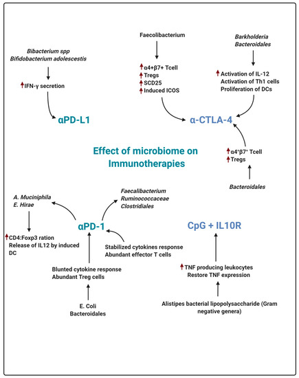 In recent research, unique species of microbiome influences the immune response to four major immunotherapies commonly used and its mechanism. PD-1 programmed death receptor-1, PD-L1: programmed death-ligand 1; CTLA-4: cytotoxic T lymphocyte-associated protein 4; alpPD-1: anti-PD-1 therapy; alpPD-L1: anti-PD-L1 therapy; alpCTLA-4: anti-CTLA-4 therapy; CpG+ alpIL-10R; TLR9 ligand CpG plus anti-IL-10R antibody and various immunotherapy components.