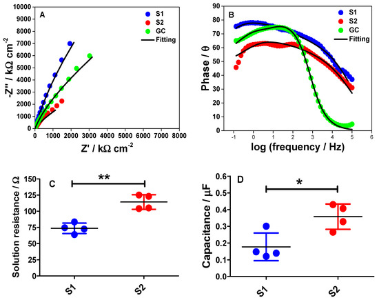 2.5. Electrochemical Impedance Spectroscopy (EIS) for S1 and S2 Electrodes