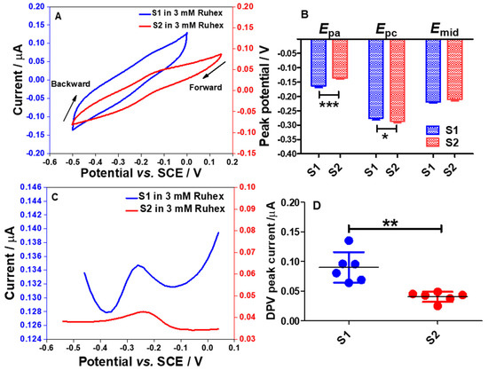 2.6. Electrochemical Responses of S1 and S2 Electrodes toward the Redox Reactions of Ruthenium Hexamine (Ruhex)