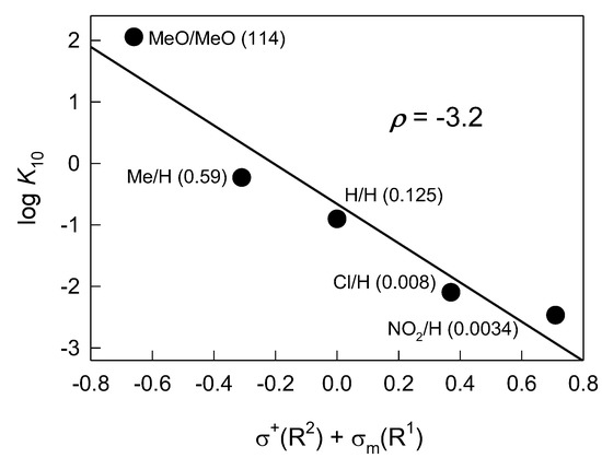 The Hammett plot for reaction in Scheme 11 created using composite σ values (see text for details). The equilibrium constants K10 (55 °C, in D3CCO2D-CDCl3) are shown in parenthesis after R1/R2 substituents in 6-1. The data are from [38].