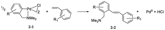 Chloro-bridged orthopalladated N,N-dimethylbenzylamine dimers 2-1 were selected as starting materials for studies of reactions with para-substituted styrenes (Scheme 4) [4] because the ability of the former to react with alkenes was already well documented [5]. The reaction run in acetic acid solvent appeared mechanistically remarkable for several reasons [6]. First, its reactants 2-1 and styrenes behaved both as nucleophiles with respect to each other, i.e., both electron-donating groups R and R1 increased the rate of alkene insertion into the Pd–C bond. Second, neutral salts such as NaClO4 unprecedently accelerated reaction in Scheme 4 due to the specific acid catalysis which manifested because of the equilibrium HOAc + NaClO4 ⇄ HClO4 + NaOAc and tiny concentrations of HClO4 did in fact accelerate the reaction.