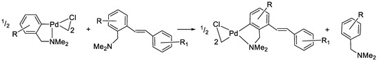 Incoming ligands involved in the ligand exchange all contain a donor center that is capable of converting palladium(II) dimers into monomeric species, if the exchange occurs as shown in Scheme 5, Scheme 6, Scheme 7, Scheme 8 and Scheme 9 and Scheme 11. The monomerization by ligands such as pyridine may occur very quickly [39], and a starting palladium(II) complex to consider may be either 6-2 dimer or 6-3 monomer (Figure 7).