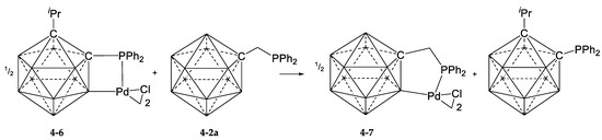 The transformations in the carborane series offered an example of the ligand exchange involving a P-donor B-cyclopalladated complex and a P-donor incoming ligand, the B–H bond of which is metalated (Scheme 8). The reaction between the four-membered cyclopalladated chloro-bridged dimer 4-6 and free 4-2a yields the five-membered B-palladated complex 4-7 in 65% yield. The P/P exchange takes place when just 4-2a is the incoming ligand. No similar migration of PdII was observed at PhCH2PPh2 or o-PhCB10H10CN=NPh.