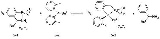 Chiral primary amine complex 5-1 is stereochemically advantageous compared to other chiral palladacycles. Its α-methyl-substituted analogue, which is less bulky than 5-1, reacted with a 66% yield of 5-3 but with just 13% ee. The complex incorporating N-methyl-α-But derivative, i.e., secondary amine, was practically unreactive (just 8% yield with less than 9% ee at 60 °C for 132 h) [34]. Attempts to transfer chirality from 5-1 at ferrocenylmethylphosphine 5-4, i.e., to synthesize a planar chiral palladacycle (Figure 5), were much less successful under the same conditions as for 5-2. Planar chiral C,P-dimer (SPl,SPl)-5-5 was isolated with only a moderate enantiomeric excess of 44% at 26% chemical yield [34].