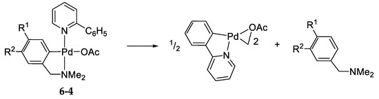 Despite such a variation, identical rate laws were established for the two cases. The exchange followed first-order kinetics in the palladium(II) material and zero-order kinetics in either 2-phenylpyridine or azobenzene. The zero-order was fully anticipated for 2-phenylpyridine, since the reaction of 6-4 is intramolecular (Scheme 13), though a similar observation for azobenzene pointed to a dissociative mechanism of the exchange with a rate-limiting departure of the cyclopalladated fragment of 6-2. All kinetic data for process (12) are also consistent with a dissociative mechanism which holds in the entire series of PdII complexes 6-4 as suggested by a perfect isokinetic dependence shown in Figure 8. The regression coefficient equals 0.99 and the calculated isokinetic temperature of 184 °C is far away from a temperature range used for collecting experimental data [38].