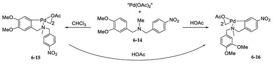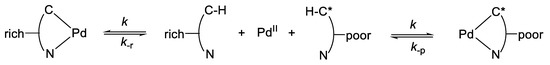 The dissociative mechanism of reaction in Scheme 13 implies that the initially cyclopalladated ligand departs first and this step is rate limiting. The departure of a bidentate ligand creates a co-ordinatively unsaturated or solvento electrophilic palladium(II) intermediate 6-8, which cleaves a proper C–H bond of the incoming ligand (Scheme 14). The intermediate may attack the C–H bond of the dissociated ligand as well and it is a question of a thermodynamic control where PdII finds itself after completion of the exchange (see below). Intimate mechanistic options for the departure are associated with the question of which bond of the palladacycle is cleaved first, i.e., N–Pd or C–Pd (Scheme 14). The C–Pd variant agrees with the principle of microscopic reversibility because cyclopalladation starts with an N-co-ordination of incoming ligand followed by C–H bond palladation [2,37].