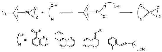 - Ryabov, A.D.; van Eldik, R. A simple access to homo- and heteroleptic platinum complexes by cycloplatination without the use of organolithium compounds. Angew. Chem. Int. Ed. Engl. 1994, 33, 783–784. [Google Scholar] [CrossRef]