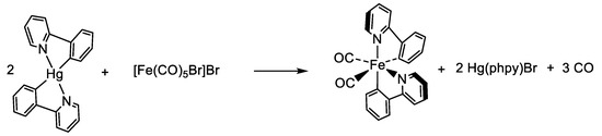 - Estrada-Montaño, A.S.; Gries, A.; Oviedo-Fortino, J.A.; Torres-Gutierrez, C.; Grain-Hayton, A.; Marcial-Hernández, R.; Shen, L.Q.; Ryabov, A.D.; Gaiddon, C.; Le Lagadec, R. Dibromine Promoted Transmetalation of an Organomercurial by Fe(CO)5: Synthesis, Properties, and Cytotoxicity of Bis(2-C6H4-2′-py-κC,N)dicarbonyliron(II). Organometallics 2020, 39, 1842–1854. [Google Scholar] [CrossRef]