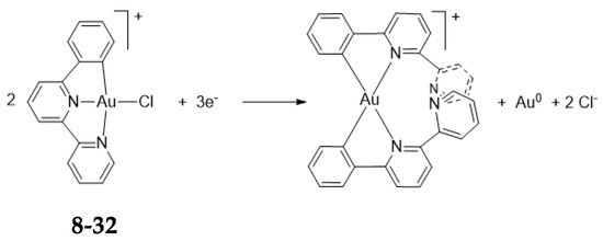 - Sanna, G.; Pilo, M.I.; Spano, N.; Minghetti, G.; Cinellu, M.A.; Zucca, A.; Seeber, R. Electrochemical behaviour of cyclometallated gold(III) complexes. Evidence of transcyclometallation in the fate of electroreduced species. J. Organomet. Chem. 2001, 622, 47–53. [Google Scholar] [CrossRef]