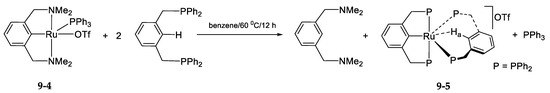 - Dani, P.; Toorneman, M.A.M.; Van Klink, G.P.M.; Van Koten, G. Complexes of Bis-ortho-cyclometalated Bisphosphinoaryl Ruthenium(II) Cations with Neutral Meta-bisphosphinoarene Ligands Containing an Agostic C–H·Ru Interaction. Organometallics 2000, 19, 5287–5296. [Google Scholar] [CrossRef]