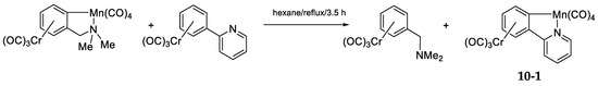 - Djukic, J.-P.; Maisse, A.; Pfeffer, M. Cyclomanganated (η6-arene)tricarbonylchromium complexes: Synthesis and reactivity. J. Organomet. Chem. 1998, 567, 65–74. [Google Scholar] [CrossRef]