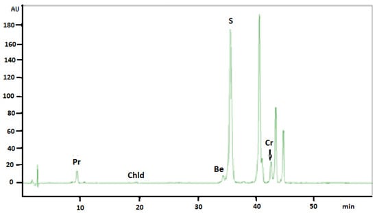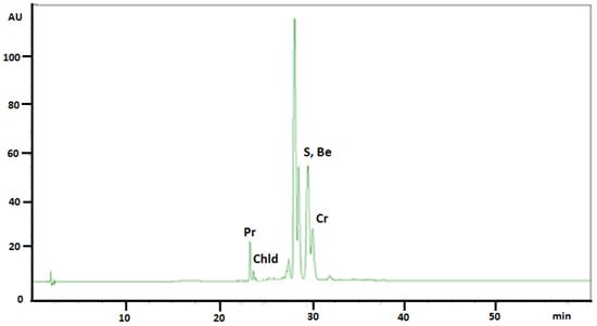 HPLC-DAD chromatogram obtained from Sanguinaria canadensis extract collected during flowering. Be: Berberine; Cr: Chelerythrine; Chld: Chelidonine; Pr: Protopine; S: Sanguinarine.
