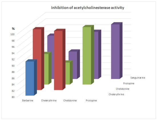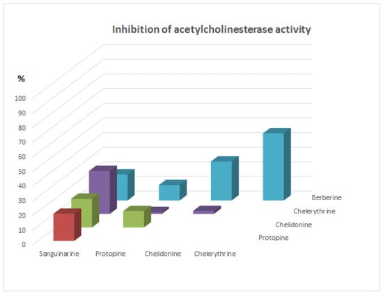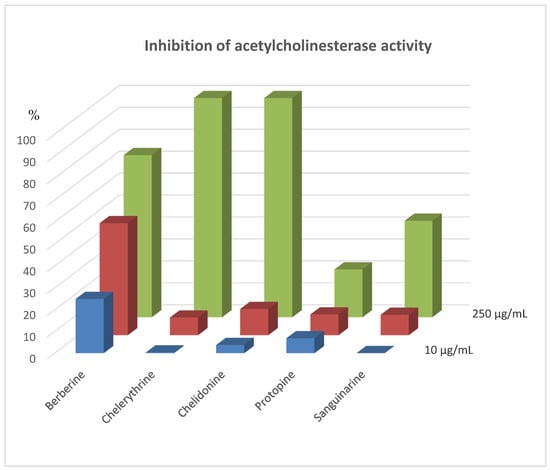 Investigations of acetylcholinesterase inhibition activity were performed after addition of 5, 25, and 125 µL of alkaloid standard solutions at concentration 1 mg/mL. Concentrations of alkaloid standards in final solutions were 10, 50, and 250 µg mL−1, respectively. Results were presented as % inhibition of acetylcholinesterase activity (Figure 1). After addition of 5 µL of alkaloids standards inhibition activities were very low except berberine (about 25% inhibition). Furthermore, after the addition of 25 µL of alkaloid standards, the inhibition was not too high. For this concentration, berberine also showed the highest activity. While, very high inhibition activity was observed for most alkaloids after the addition of 125 µL of their standards. The lowest activity was determined for protopine (only about 22% of inhibition), while the other alkaloids reduced the activity of acetylcholinesterase more than 40%. Chelerythrine and chelidonine caused 100% inhibition of acetylcholinesterase activity.