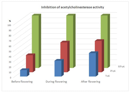 % inhibition of acetylcholinesterase activity after application of 10, 50, or 250 µg/mL solutions of Sanguinaria canadensis extracts obtained before, during, and after flowering.