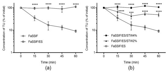 The stability of TU was assessed in fasted state simulated intestinal fluid with added esterase activity (FaSSIF/ES; 20 IU/mL) in the presence of 0%, 2%, and 4% STW extract (weight of freeze-dried STW powder per volume of the medium). FaSSIF was prepared according to the literature [17]. The stability of TU in FaSSIF/ES was performed as described in the literature [18,19]. The reaction medium (1 mL) was incubated at 37 °C for 5 min prior to the experiment. The reaction was then initiated by the addition of TU to yield a concentration of 10 μM. Samples (100 µL each) were withdrawn at 0, 15, 30, 45, and 60 min. Three-hundred microliter of ice-cold acetonitrile (ACN) was immediately added to the samples to stop the reaction. Later, samples were prepared for HPLC-UV analysis in the same day as described below. In addition, TU stability was assessed in FaSSIF without esterase to determine the chemical stability. The depletion rate constant of TU (k) was obtained from the plot of logarithmic concentrations of TU (% of concentration at time 0) versus time. The elimination half-life (t1/2) of TU depletion was then calculated according to Equation (1). Experiments were performed in quadruplet.
