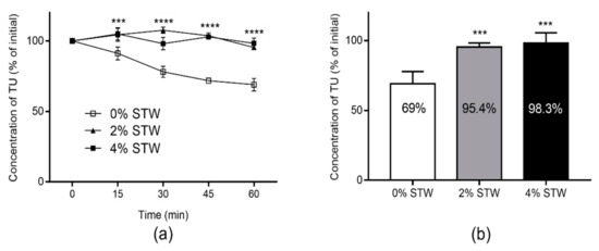 Further, we used Caco-2 cell homogenates to assess the effect of STW on the intestinal first-pass metabolism of TU. In fact, we previously applied the degradation of TU in Caco-2 cell homogenate to predict the fraction of TU that could escape intestinal metabolism, which was as low as 11% of the absorbed fraction [12]. In this study, STW substantially altered the depletion profile of TU in Caco-2 cell homogenates (p < 0.001; Figure 3a). At 2% freeze-dried STW, the unhydrolyzed fraction of TU in Caco-2 cell homogenate increased to around 95% compared with 69% in STW-free homogenate over 60 min incubation (Figure 3b). This can potentially increase the fraction of TU that could survive metabolism in the intestinal wall in vivo. As the intestinal wall is the main site for first-pass metabolic loss of TU relative to the liver [12], it is anticipated that exposure to T could significantly be increased after oral administration of TU. The presence of 2% STW, as illustrated in Figure 3b, almost completely inhibited the degradation of TU, suggesting that ester compounds from STW saturated the hydrolysing enzymes. Therefore, upon increasing the concentration of STW to 4%, only a minor increase in the unhydrolyzed fraction of TU was observed.