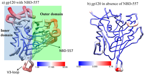 The root mean square fluctuations for gp120 shown in a worm model. The thickness of the worm radius represents the value of fluctuations (a) with NBD-557; the inner and outer domains are highlighted by blue and green transparent rectangles (b) without NBD-557. The values of RMSF (Å2) are shown by colour keys in each figure.